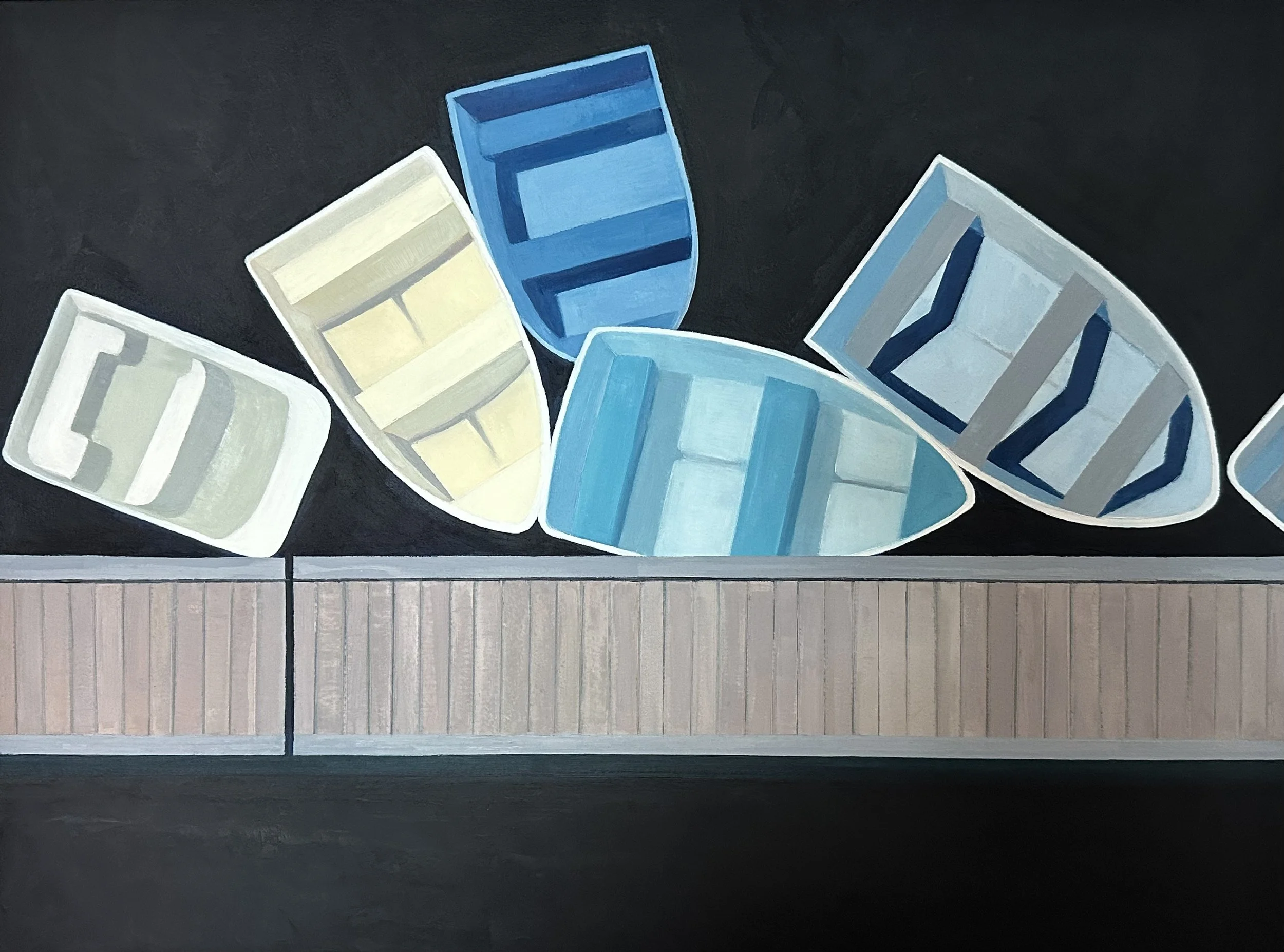 Rockport Dinghies I, 2025, oil and cold wax on paper on panel, 18 x 24”